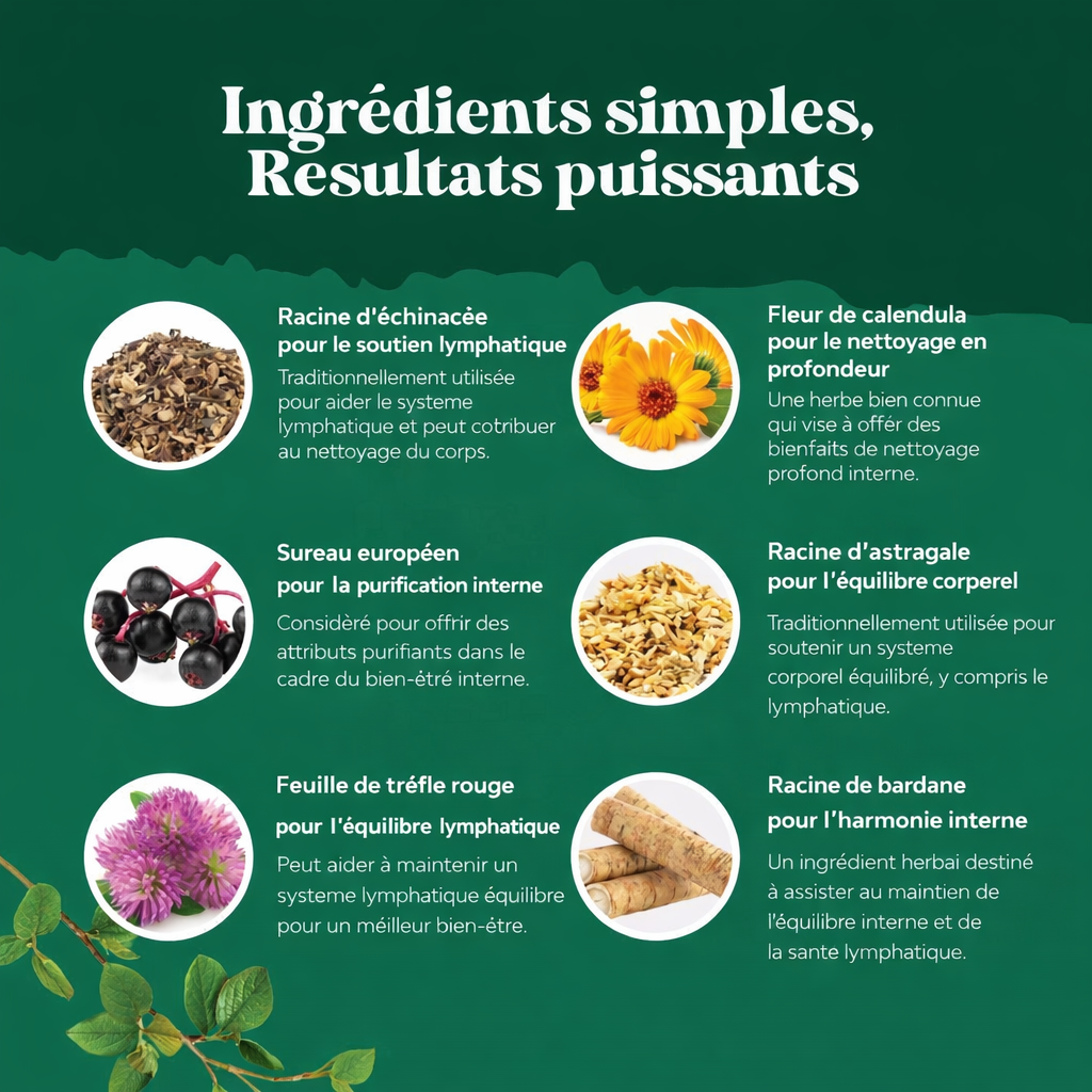 Un complexe de plantes cliniquement étudiées pour relancer votre lymphe, éliminer la rétention d'eau et retrouver une silhouette plus légère dès les premiers jours.